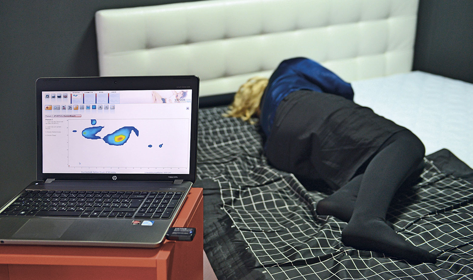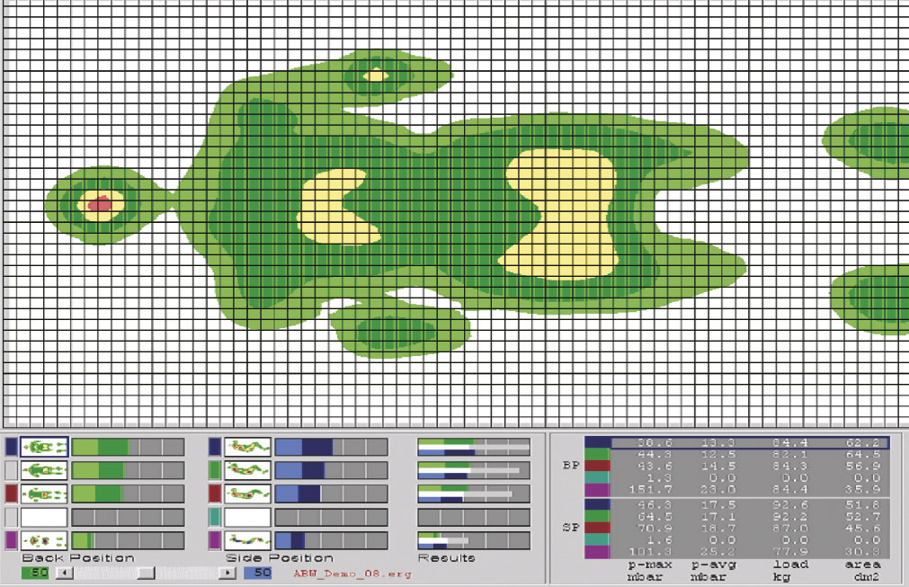 The procedure is very simple. The mat is first secured onto the bed chosen by the customer. This enables measuring the pressure between the body and the bed. The pressure of the surface is shown in colored graphics on the screen, and the results can be printed out and compared. Measured values are processed in the programme, while the results are presented in an easily understandable image of pressure distribution.